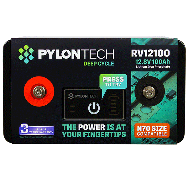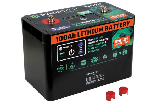 12V 100Ah Lithium Iron Phosphate battery with push button State-of-Charge indicator. Ideal for sealed lead battery replacement.