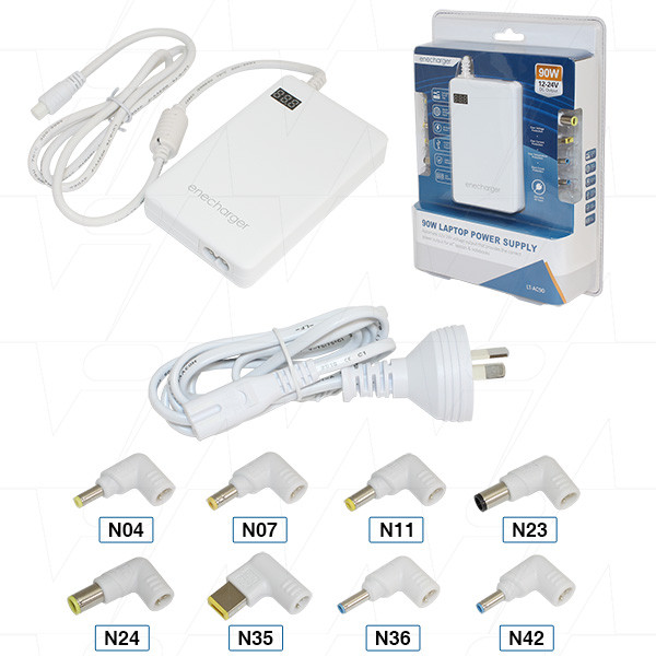 Enecharger 90W laptop power supply: 100-240V input, 12-24V output with additional USB-A output.