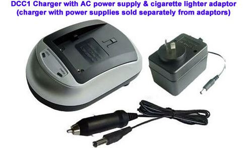 Lithium Ion digital camera and camcorder battery charger complete with 1A output world voltage 100-240VAC switchmode SAA, MEPS approved power supply & 12VDC car plug.