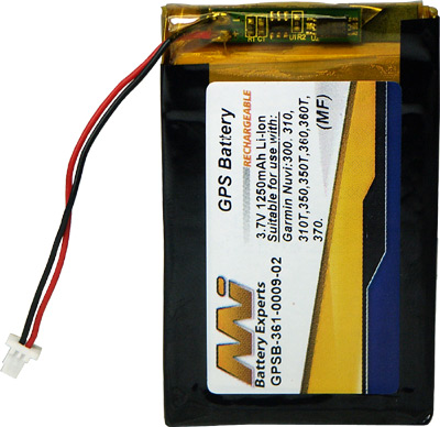 Application GPS devices Original Brand Garmin Chemistry Lithium Ion (LiIon) Voltage 3.7V Nominal Capacity 1250mAh Brand Master (this product is a compatible alternative to that of the original brand) Width 37.8mm Height 5mm Length/Breadth/Depth 59.3mm Weight 54g Garmin Nuvi 300 Garmin Nuvi 310 Garmin Nuvi 310T Garmin Nuvi 350 Garmin Nuvi 350T Garmin Nuvi 360 Garmin Nuvi 360T Garmin Nuvi 370 Compatible With: Garmin 361-00019-02 Garmin IA2B309C4B32 Comments This battery is suitable for Garmin Nuvi 300, Nuvi 310, Nuvi 310T, Nuvi 350, Nuvi 350T, Nuvi 360, Nuvi 360T, Nuvi 370 GPS & replaced the internal lithium ion battery models 361-00019-02 & IA2B309C4B32. Information on Replacement Batteries
