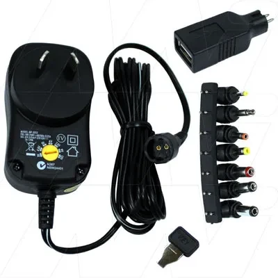 3, 4.5, 5, 6, 7.5, 9 or 12VDC Regulated output voltage.Supplied with 7 plug sizes.