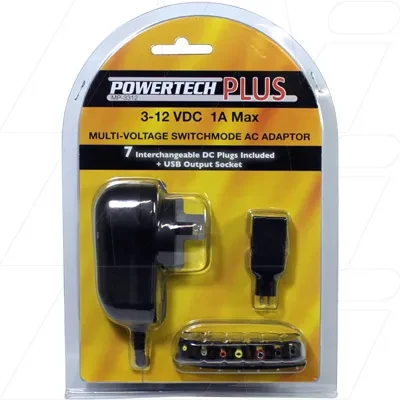 Powertech MP3312 Power Supply 100-240VAC to 3, 4.5, 5, 6, 7.5, 9 or 12VDC 1A